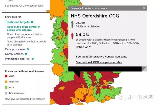 上图显示笔者所在牛津郡糖尿病病人血糖控制情况,有效控制率为59%,在209个CCG中排名第140位。