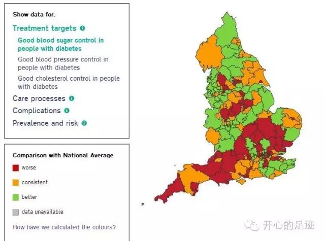 QOF有强大的信息系统做支撑,在卫生部网站上,针对糖尿病、高血压疾病管理项目,用地图展示各个地区(CCG——临床采购集团)工作开展情况。上图为糖尿病管理中血糖控制情况的对比,绿色代表较好,黄色代表中等,红色代表较差。年度数据可以随时查询、对比。