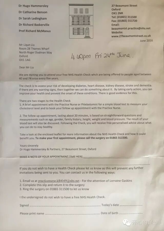 笔者在英国学习6个月,在全科诊所进行了注册。这是近期诊所给我寄来“邀请”体检的信件。为体验服务,笔者进行了预约,择日由诊所护士为我做了一次体检。值得一提的是,信中最后一栏是居民拒绝参加体检的签字确认信息,尊重居民的选择权,同时NHS在统计时将作为“除外项”处理。